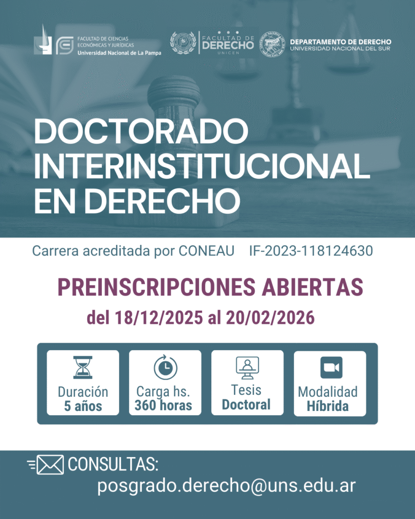 Título a obtener: Doctor/a en Derecho. con titulación conjunta entre la Universidad Nacional del Centro de la Provincia de Buenos Aires – Facultad de Derecho, la Universidad Nacional de La Pampa – Facultad de Cs. Económicas y Jurídicas, y la Universidad Nacional del Sur – Departamento de Derecho